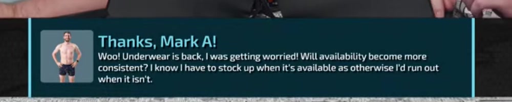 | Mark A | message | Thanks, Mark A! Woo! Underwear is back, I was getting worried! Will availability become more consistent? I know I have to stock up when it's available as otherwise I'd run out when it isn't. | Timestamp | ![]() |