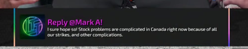 | Mark A | reply | Reply @Mark A! I sure hope so! Stock problems are complicated in Canada right now because of all our strikes, and other complications. | Timestamp | ![]() |
