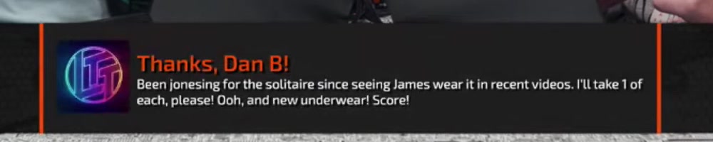| Dan B | message | Thanks, Dan B! Been jonesing for the solitaire since seeing James wear it in recent videos. I'll take 1 of each, please! Ooh, and new underwear! Score! | Timestamp | ![]() |