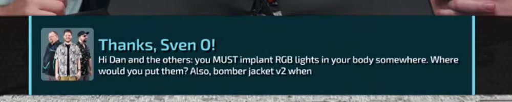 | Sven O | message | Thanks, Sven O! Hi Dan and the others: you MUST implant RGB lights in your body somewhere. Where would you put them? Also, bomber jacket v2 when | Timestamp | ![]() |