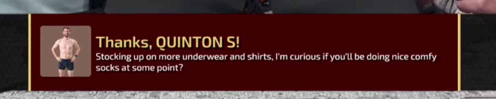 | QUINTON S | message | Thanks, QUINTON S! Stocking up on more underwear and shirts, I'm curious if you'll be doing nice comfy socks at some point? | Timestamp | ![]() |