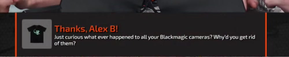 | Alex B | message | Thanks, Alex B! Just curious what ever happened to all your Blackmagic cameras? Why'd you get rid of them? | Timestamp | ![]() |