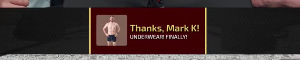 | Mark K | message | Thanks, Mark K! UNDERWEAR! FINALLY! | Timestamp | ![]() |